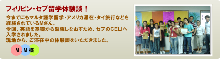 CELIは、学校の建物もきれいで、特にフィットネスジムはマシンといい設備といい、すごく充実しているので使いがいがあります。宿舎もエアコン、冷蔵庫、ホットシャワー、電話が付いていて、掃除も頻繁にしてくれるので快適です。タクシーに少し乗ればBarやClub、大きなショッピングセンターなど、いろいろ遊ぶところもあるので、放課後や週末の外出先には困りません。セブにはダイビングスポットがたくさんあるそうなので、こっちにいる間に絶対ライセンスをとろうと思っています。友達と数人でとりに行くと安くなるとか、いろいろあるみたいなので、今学校のActivity Managerにいろいろ相談しているところです。