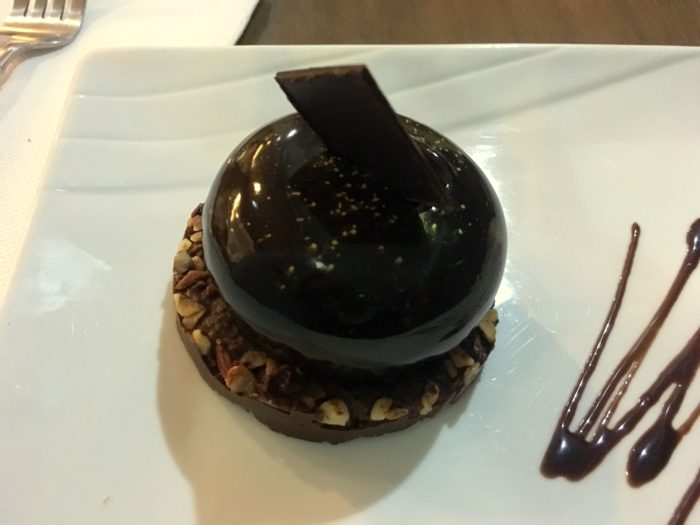ドームの中には甘さ控えめのチョコレートムースが入っていて、台座のナッツのサクサク感となめらかなムース、ドームの濃厚なチョコレートの組み合わせがたまりません。