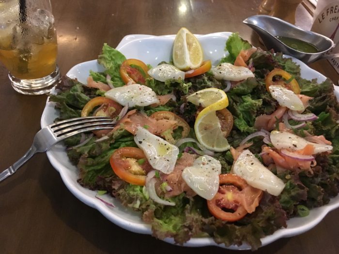 新鮮なスモークサーモンと帆立がこれでもかと入っているかなりボリュームのあるサラダですが、レモンドレッシングがさっぱりしているので、ペロッと食べられます。お料理を注文すると籠入りのパンとバターも出てくるので、パンとサラダだけで軽い食事になります。