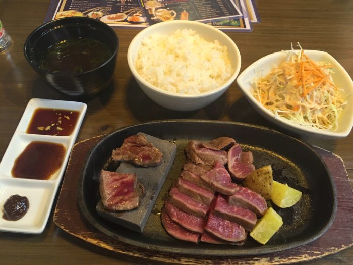 ヒートステーキは、熱した溶岩プレートと一緒に出てきて焼きながら食べられます。100gの少量サイズがあるのが嬉しいです。