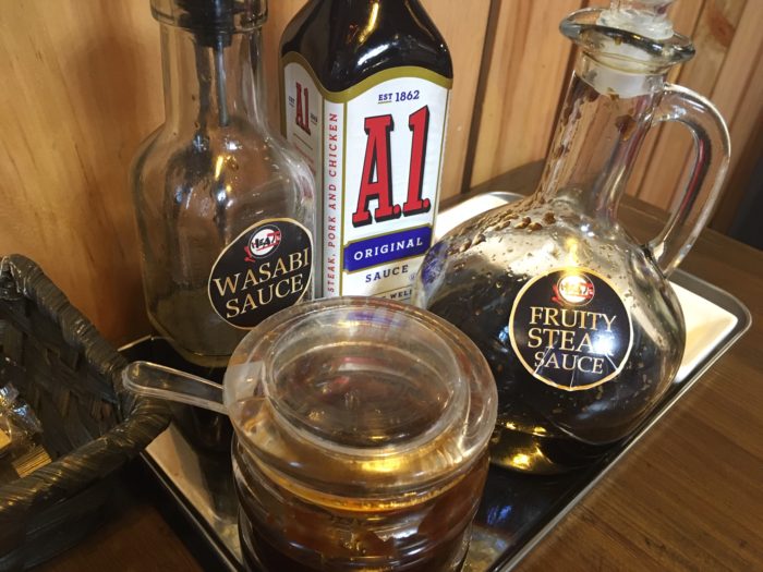 フィリピンだと、ステーキはだいたいガーリックソース一択なのですが、ここのお店では、ガーリックソースの他にワサビソース・フルーティーステーキソース・味噌だれ・A1ステーキソース等数種類のソースを自由に使えるのが日本人には嬉しいです。