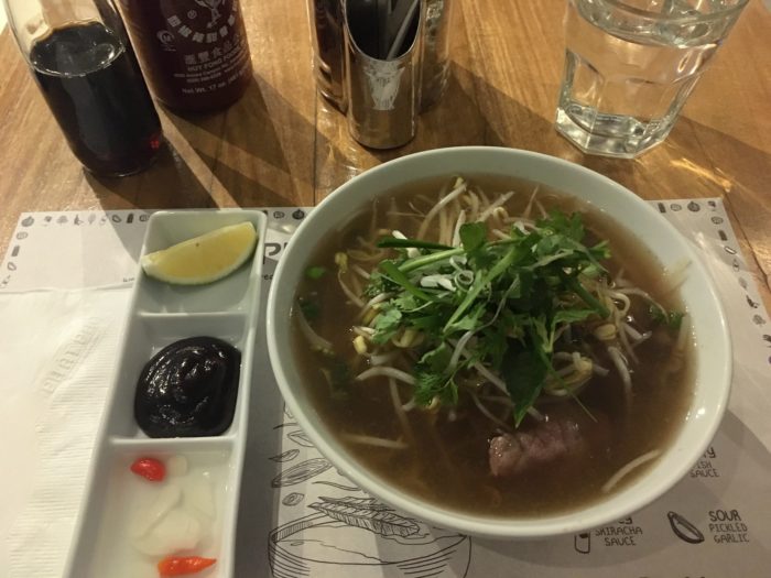 ビーフ・フォーは279ペソ(約586円)。牛肉だしのあっさり目スープに、お米の麺と薄切り牛肉ともやしが入っていて、パクチーを乗せ、ライムを絞って食べます。