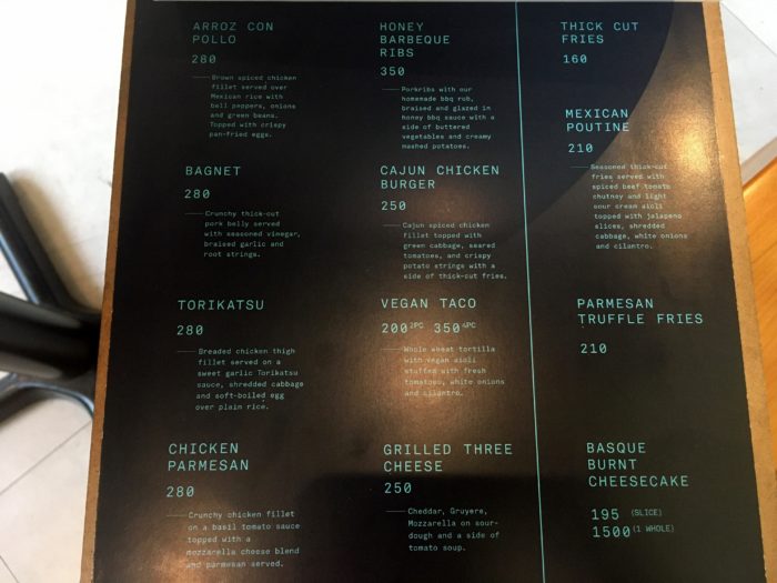 3種のチーズトースト・トマトスープ付き250ペソ(約525円)と、バスクチーズケーキ195ペソ(約410)も気になります。