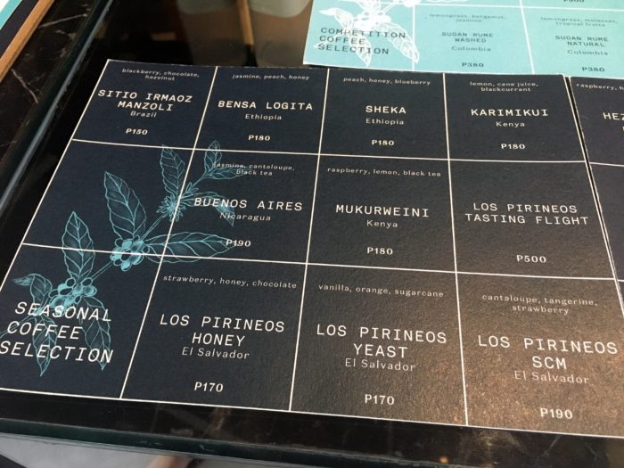 シンプルなコーヒーは150ペソからで、豆は次の「Seasonal Coffee Selection(季節のコーヒー豆)」と「Competition Coffee Selection(コンテスト出場 or 受賞豆)」から選べます。