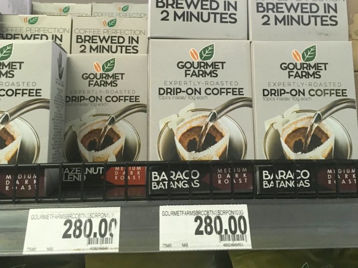 ローカルコーヒーのGourmet Farmsドリップバッグ:10袋280ペソ(1パック28ペソ=約61円)