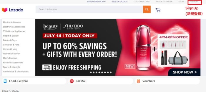 まず、Lazadaの公式サイト(https://www.lazada.com.ph/)へ行き、ホームページの右上にある SIGNUP(新規登録)を選択します。