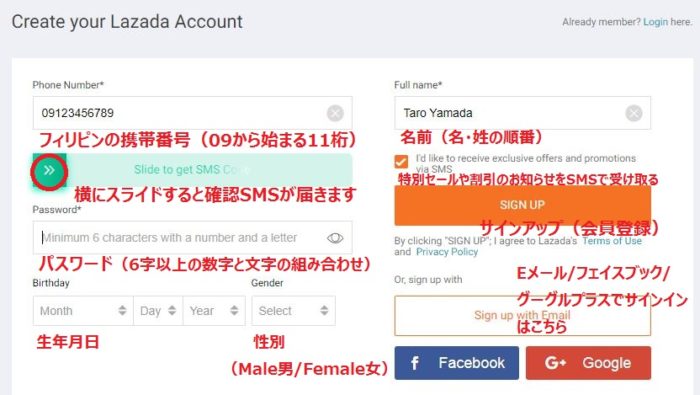フィリピンの電話番号がある場合は、電話番号・パスワード・生年月日・名前を入力します。