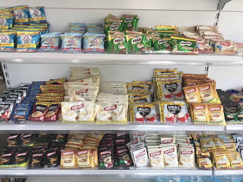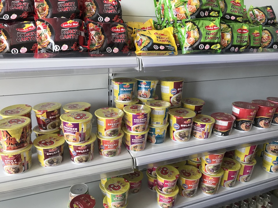カップラーメンは22ペソ〜(約46円)。袋ラーメンは10ペソ〜(約21円)。海外で製造している日清のカップヌードルも置いてあります。5ペソでカップラーメンにお湯を入れてもらえます。