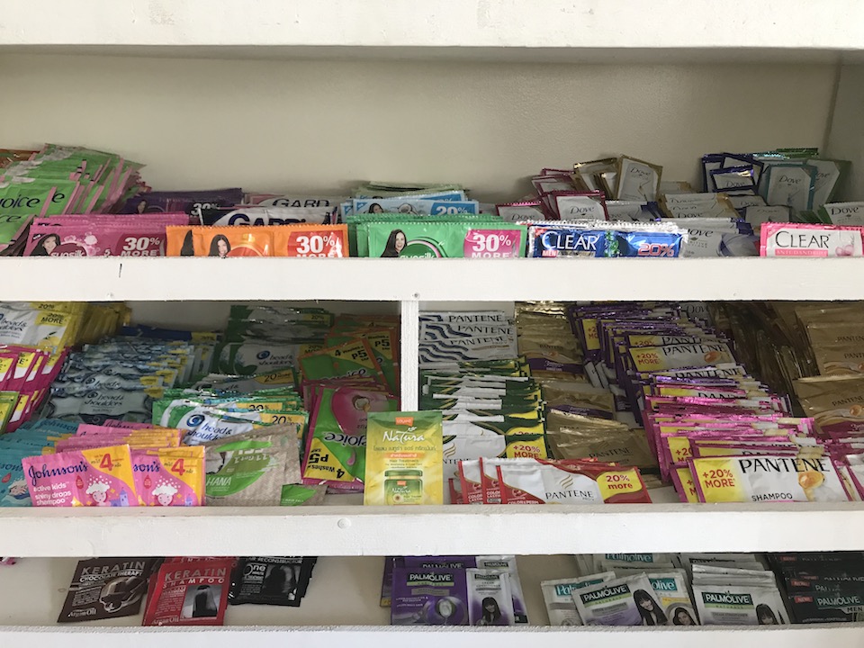 使い切りのシャンプーとコンディショナーが一袋7ペソ〜(約14円)。