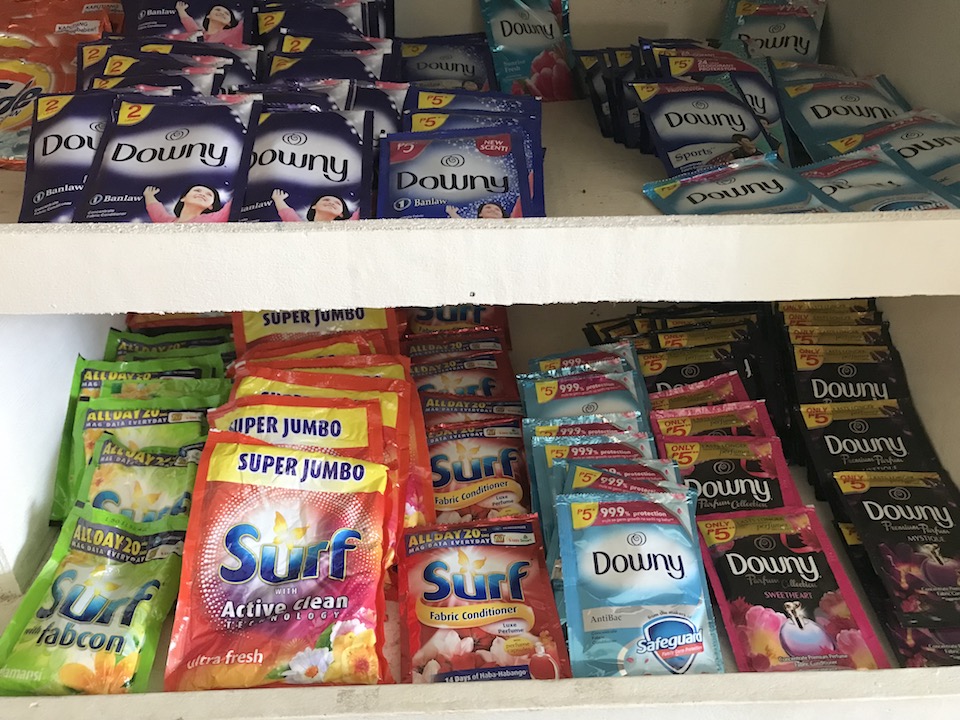 洗濯洗剤の使い切りパックは6ペソ〜(約12円)。いろんな香りや種類があり、安いので色々と試せていいですね。