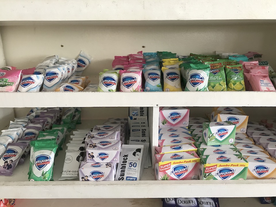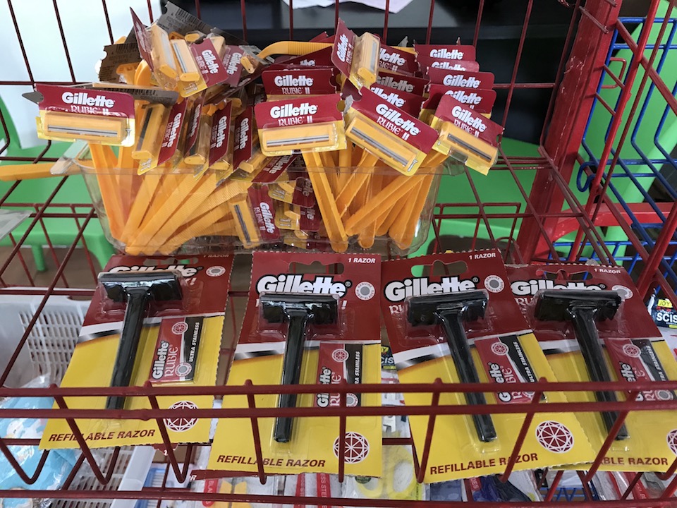 カミソリ一つ25ペソ(約52円)。 歯ブラシや歯磨き粉、クシや髪の毛を束ねるゴム、乳液なども種類は少ないですが置いています。
