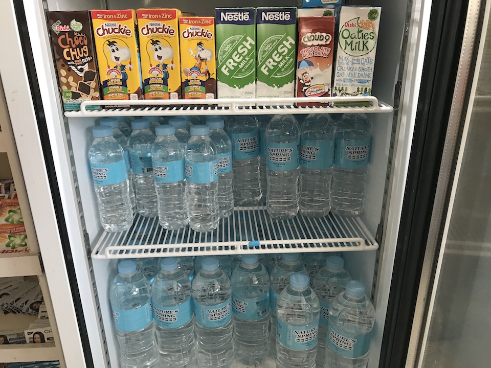 続いて飲料をご紹介。お水は355mlが10ペソ(約21円)、500mlが15ペソ(約32円)、1Lが25ペソ(約52円)。牛乳は42ペソ(約88円)
