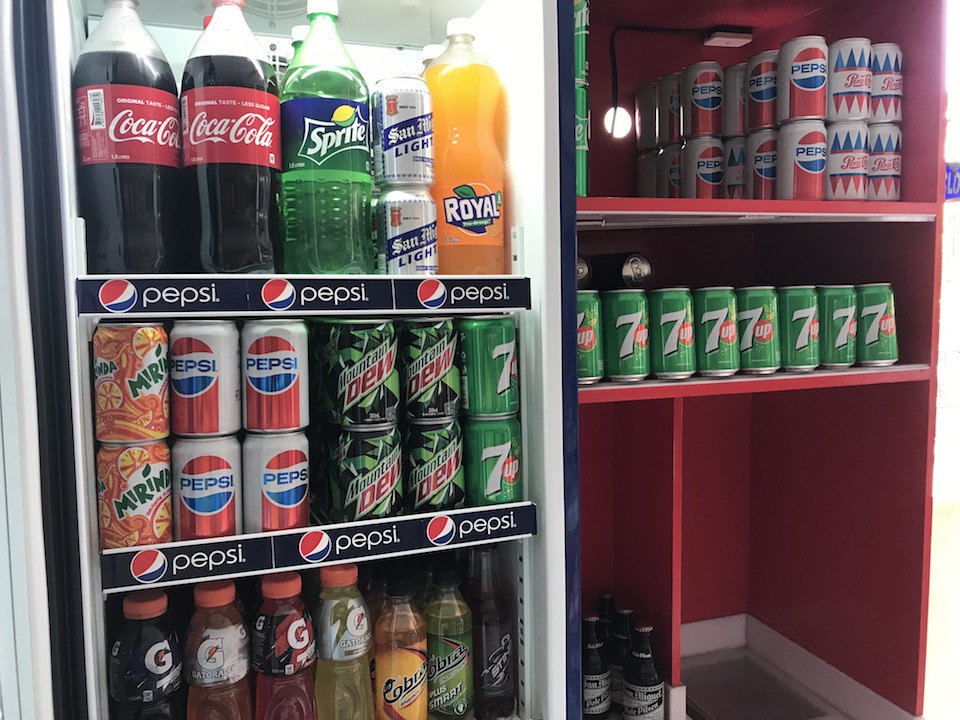 ソフトドリンクはサイズに応じて10ペソ(約21円)から。