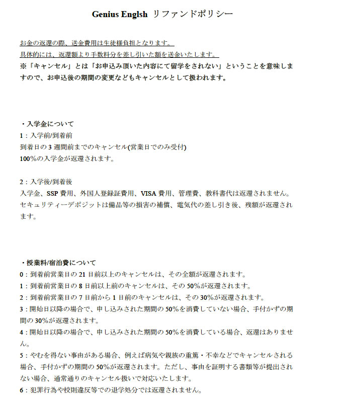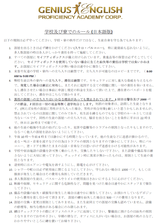 Genius English SCHOOL POLICY 学校規則