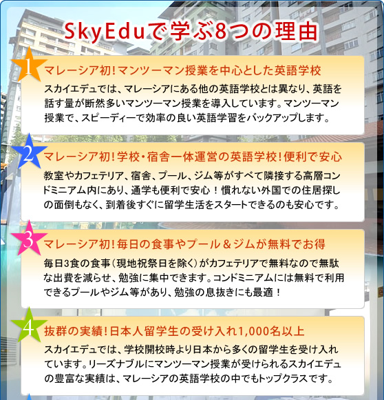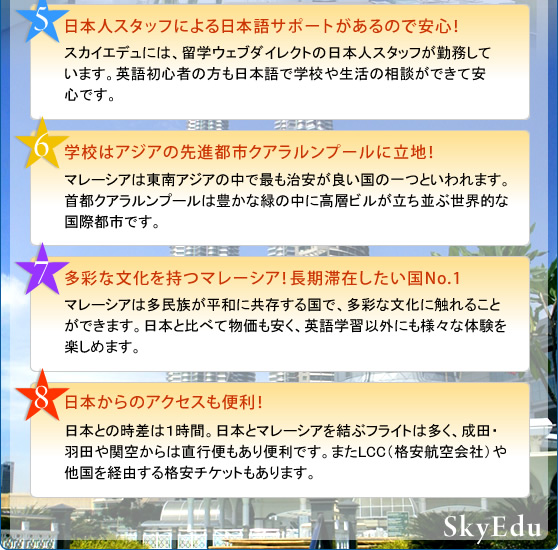 高層ビルと南国の雰囲気が融和し、シティリゾートとも形容されるマレーシアのクアラルンプールに立地するSkyEduグローバルカレッジでは、留学ウェブダイレクトの日本人スタッフが勤務していますので、日本語でのサポートも可能です。